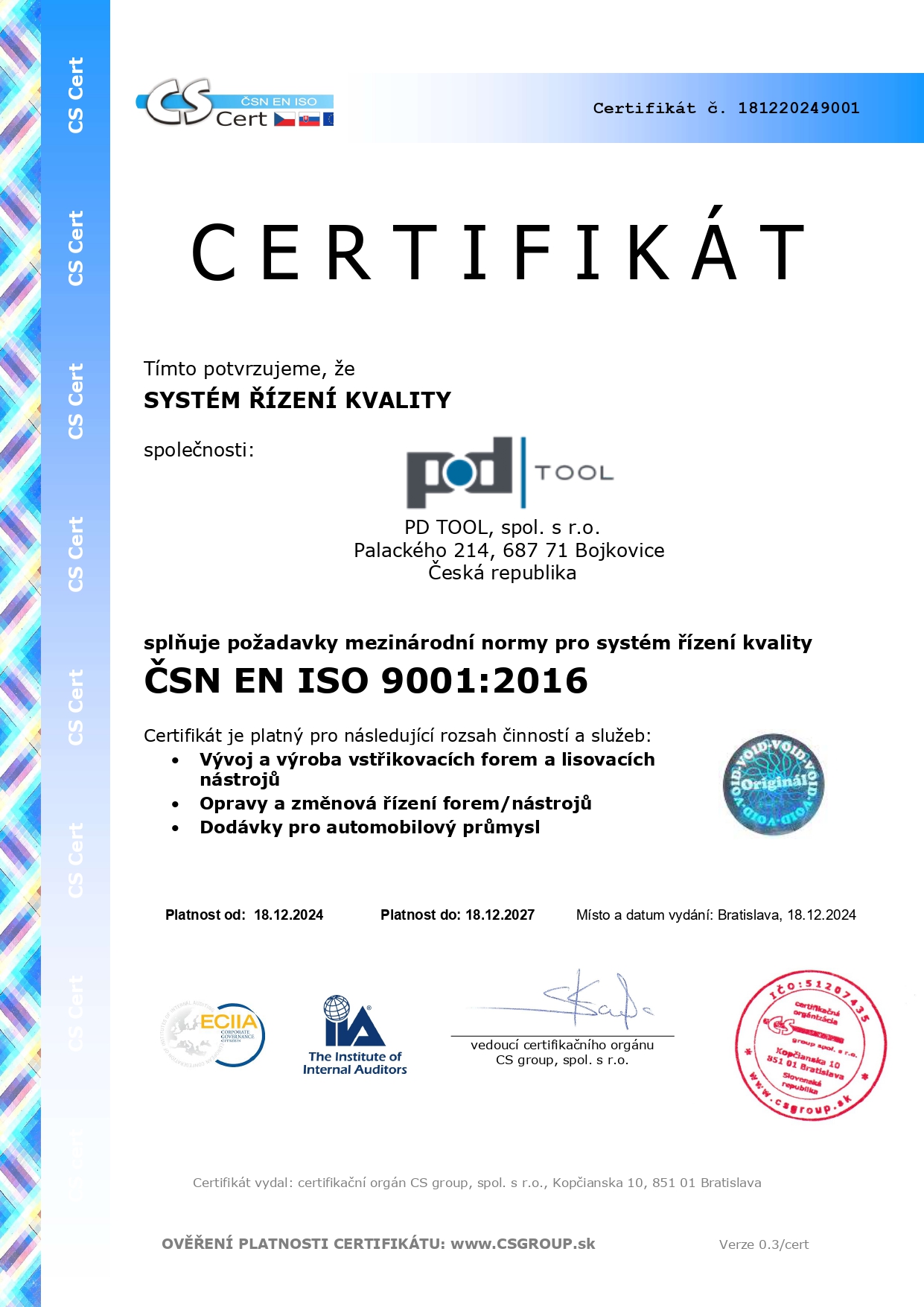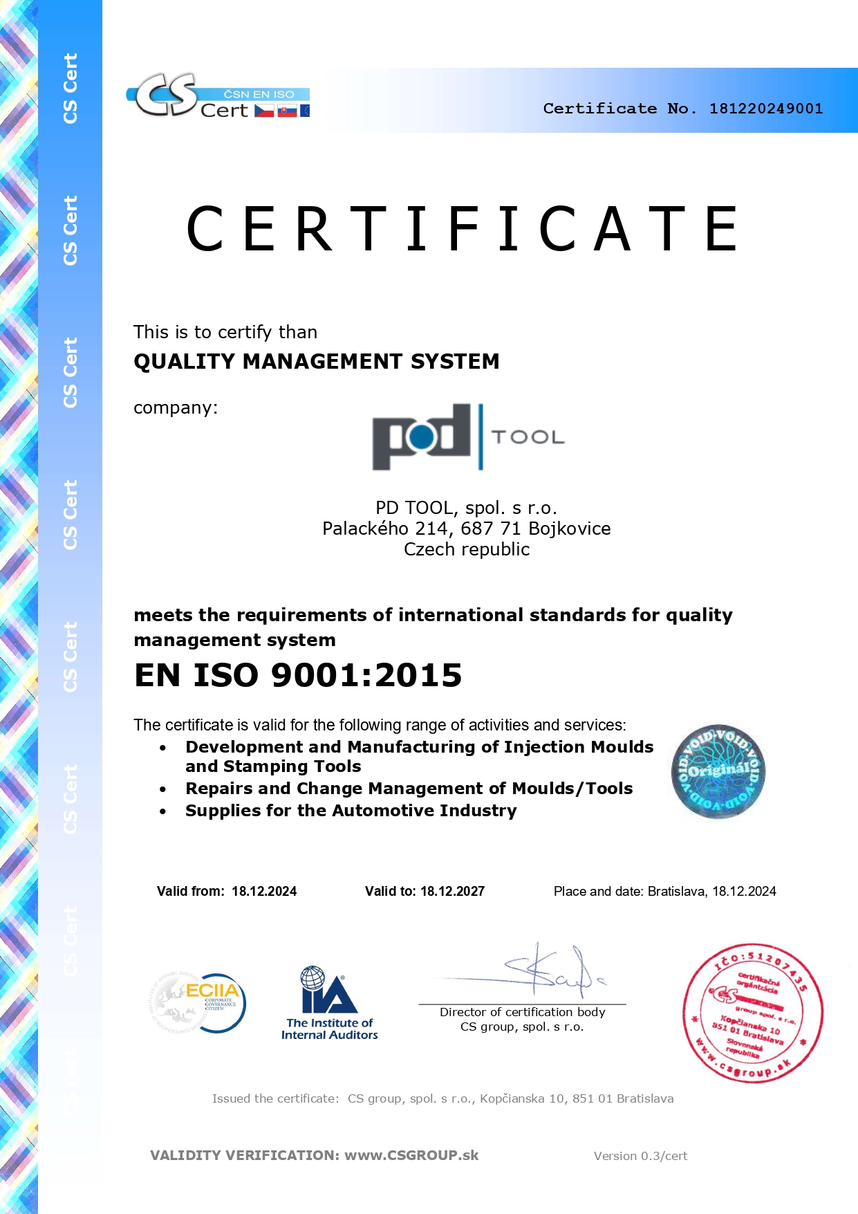 Naším hlavním cílem je spokojenost zákazníků, proto si zakládáme na kvalitě našich výrobků. Společnost PD TOOL v roce 2024 zavedla systém řízení kvality podle normy ISO 9001.
